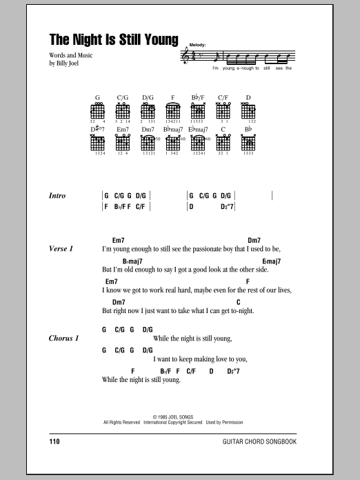 Download or print Billy Joel The Night Is Still Young sheet music, chords and digital score arranged for Piano, Vocal & Guitar Chords (Right-Hand Melody). This Pop score includes 10 page(s).