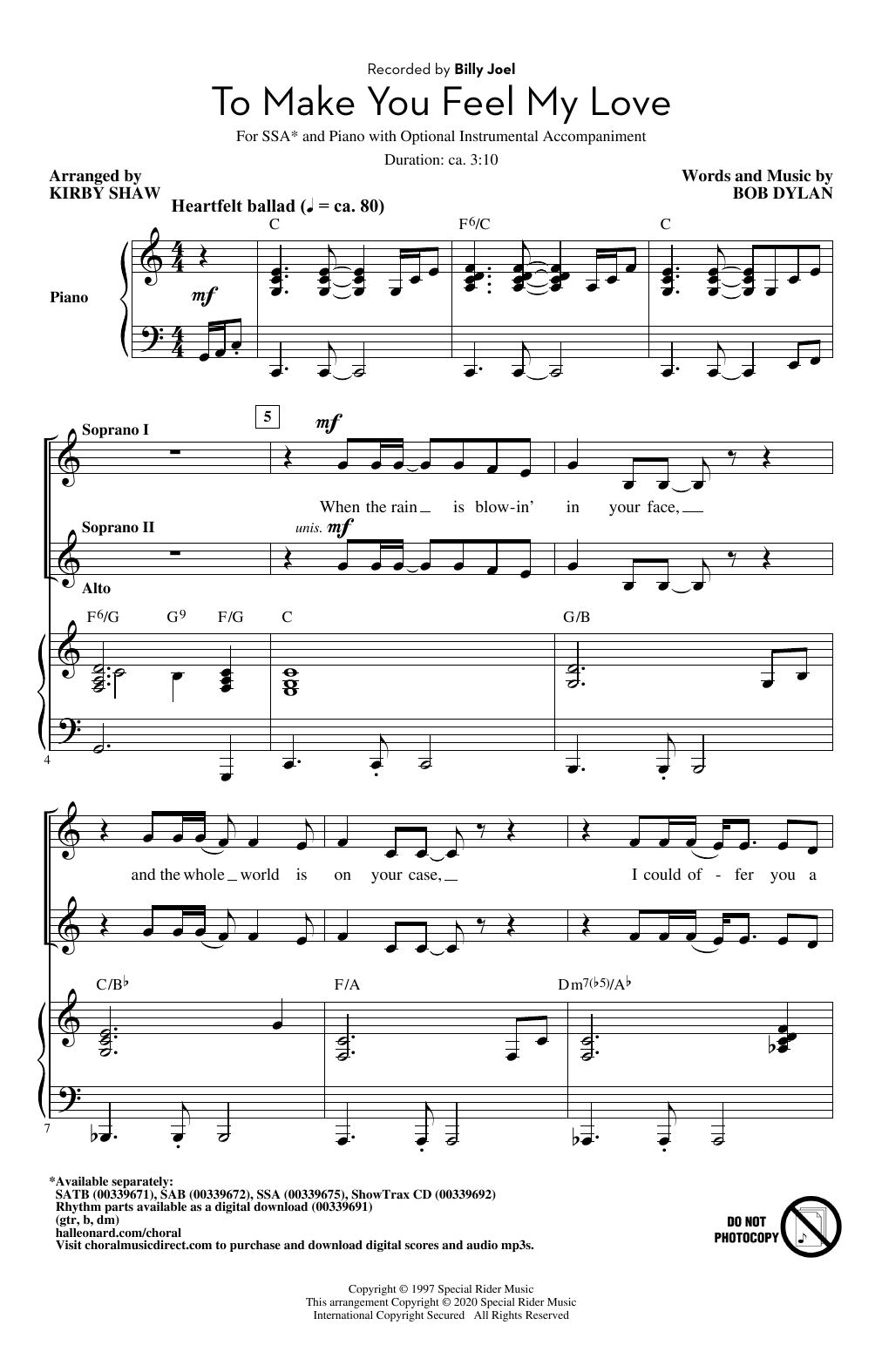 Download or print Billy Joel To Make You Feel My Love (arr. Kirby Shaw) sheet music, chords and digital score arranged for SSA Choir. This Pop score includes 9 page(s).
