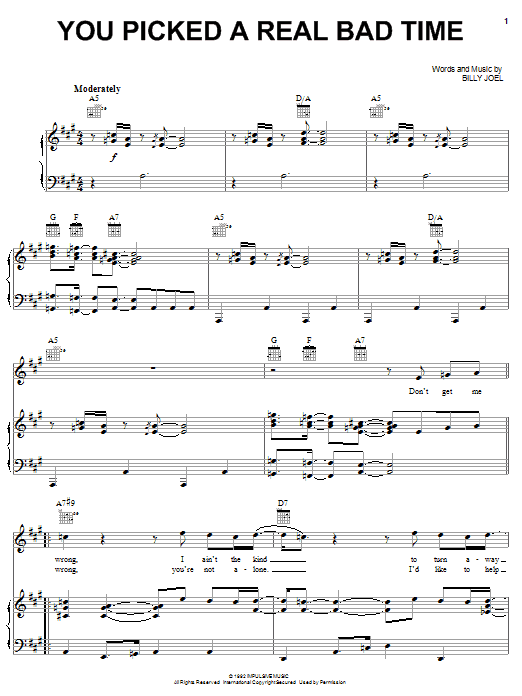 Download or print Billy Joel You Picked A Real Bad Time sheet music, chords and digital score arranged for Piano, Vocal & Guitar Chords (Right-Hand Melody). This Pop score includes 10 page(s).