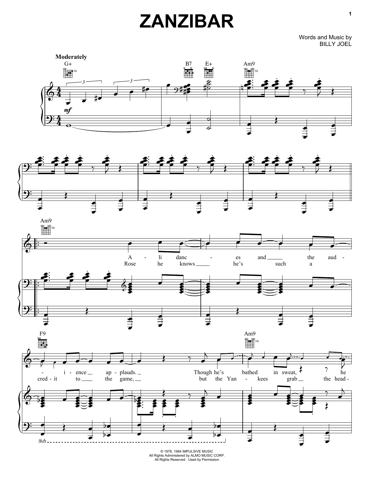 Download or print Billy Joel Zanzibar sheet music, chords and digital score arranged for Piano, Vocal & Guitar Chords (Right-Hand Melody). This Pop score includes 8 page(s).