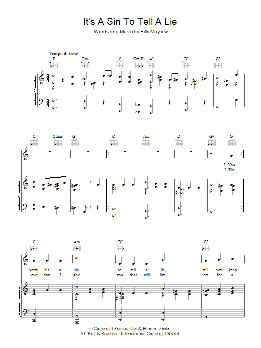 Download or print Billy Mayhew It's A Sin To Tell A Lie sheet music, chords and digital score arranged for Piano, Vocal & Guitar Chords. This Standards score includes 4 page(s).