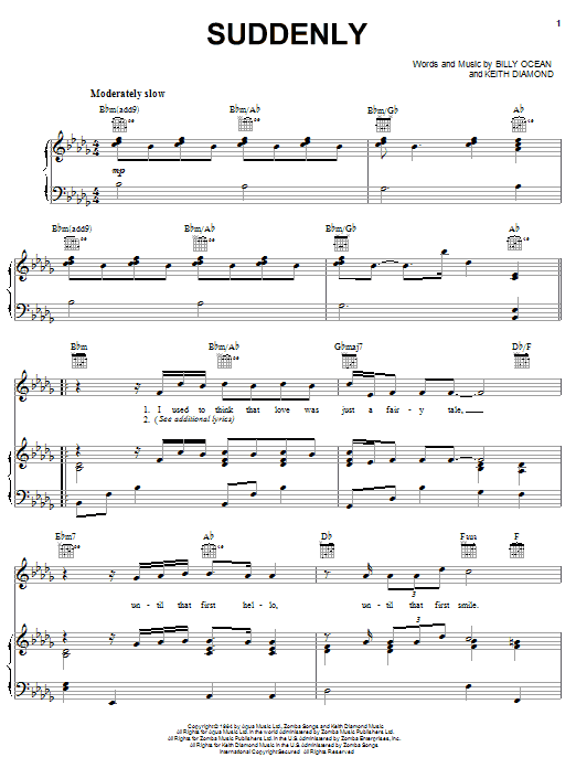 Download or print Billy Ocean Suddenly sheet music, chords and digital score arranged for Piano, Vocal & Guitar Chords (Right-Hand Melody). This Pop score includes 4 page(s).