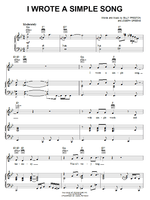 Download or print Billy Preston I Wrote A Simple Song sheet music, chords and digital score arranged for Piano, Vocal & Guitar Chords (Right-Hand Melody). This Pop score includes 9 page(s).