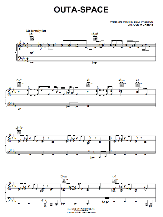 Download or print Billy Preston Outa-Space sheet music, chords and digital score arranged for Piano, Vocal & Guitar Chords (Right-Hand Melody). This Pop score includes 4 page(s).
