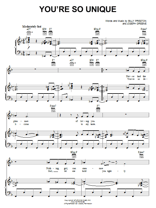 Download or print Billy Preston You're So Unique sheet music, chords and digital score arranged for Piano, Vocal & Guitar Chords (Right-Hand Melody). This Pop score includes 6 page(s).