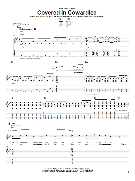 Download or print Billy Talent Covered In Cowardice sheet music, chords and digital score arranged for Guitar Tab. This Pop score includes 6 page(s).