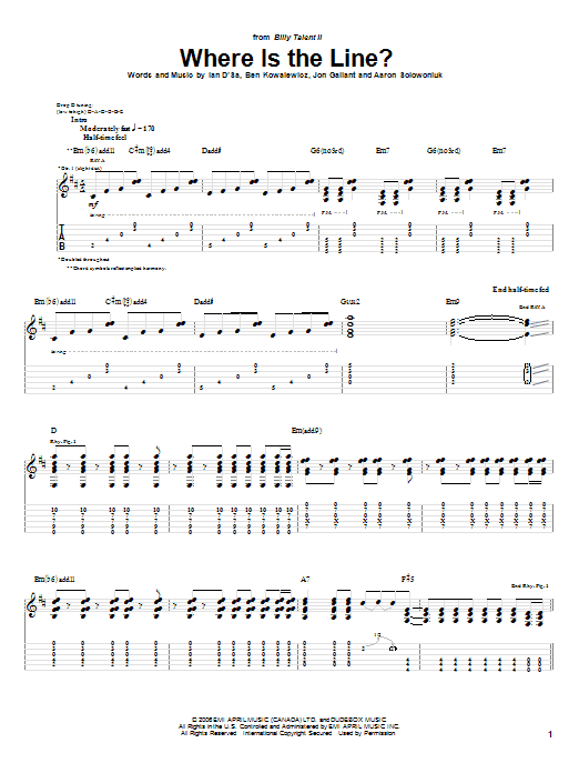 Download or print Billy Talent Where Is The Line? sheet music, chords and digital score arranged for Guitar Tab. This Pop score includes 6 page(s).