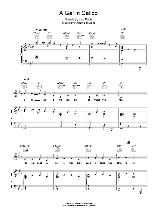 Download or print Bing Crosby A Gal In Calico sheet music, chords and digital score arranged for Piano, Vocal & Guitar Chords. This Standards score includes 5 page(s).