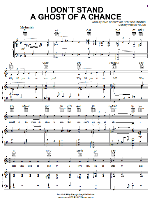 Download or print Bing Crosby I Don't Stand A Ghost Of A Chance sheet music, chords and digital score arranged for Piano, Vocal & Guitar Chords. This Jazz score includes 4 page(s).