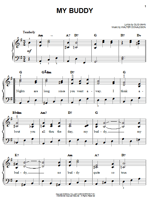 Download or print Bing Crosby My Buddy sheet music, chords and digital score arranged for Easy Piano. This Jazz score includes 2 page(s).