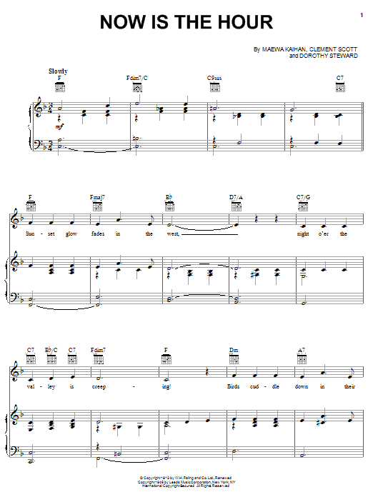 Download or print Bing Crosby Now Is The Hour (Maori Farewell Song) sheet music, chords and digital score arranged for Piano, Vocal & Guitar Chords (Right-Hand Melody). This Jazz score includes 3 page(s).