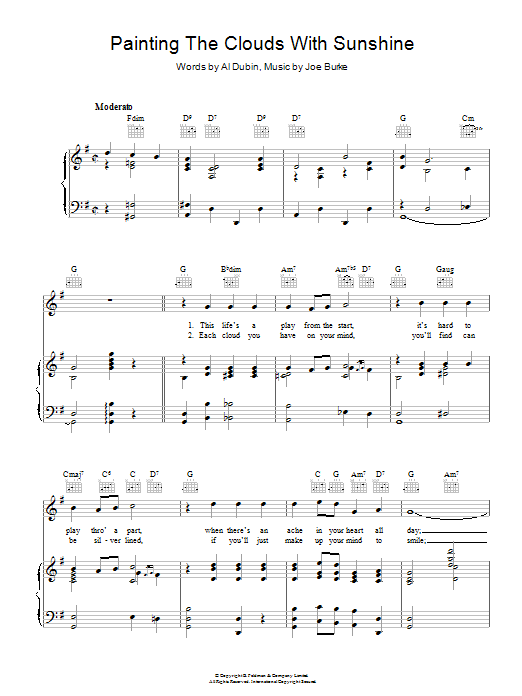 Download or print Bing Crosby Painting The Clouds With Sunshine sheet music, chords and digital score arranged for Piano, Vocal & Guitar Chords. This Standards score includes 5 page(s).
