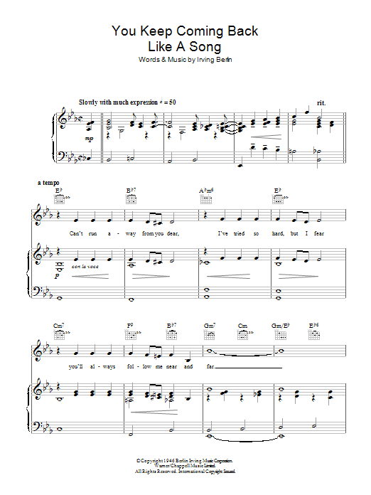 Download or print Bing Crosby You Keep Coming Back Like A Song sheet music, chords and digital score arranged for Piano, Vocal & Guitar Chords. This Standards score includes 4 page(s).