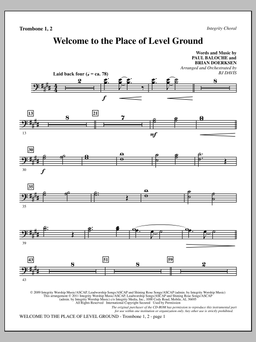 Download or print BJ Davis Welcome To The Place Of Level Ground - Trombone 1 & 2 sheet music, chords and digital score arranged for Choir Instrumental Pak. This Contemporary score includes 2 page(s).