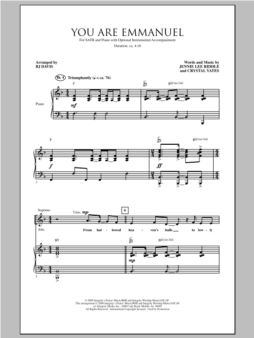 Download or print BJ Davis You Are Emmanuel sheet music, chords and digital score arranged for SATB Choir. This Christmas score includes 11 page(s).