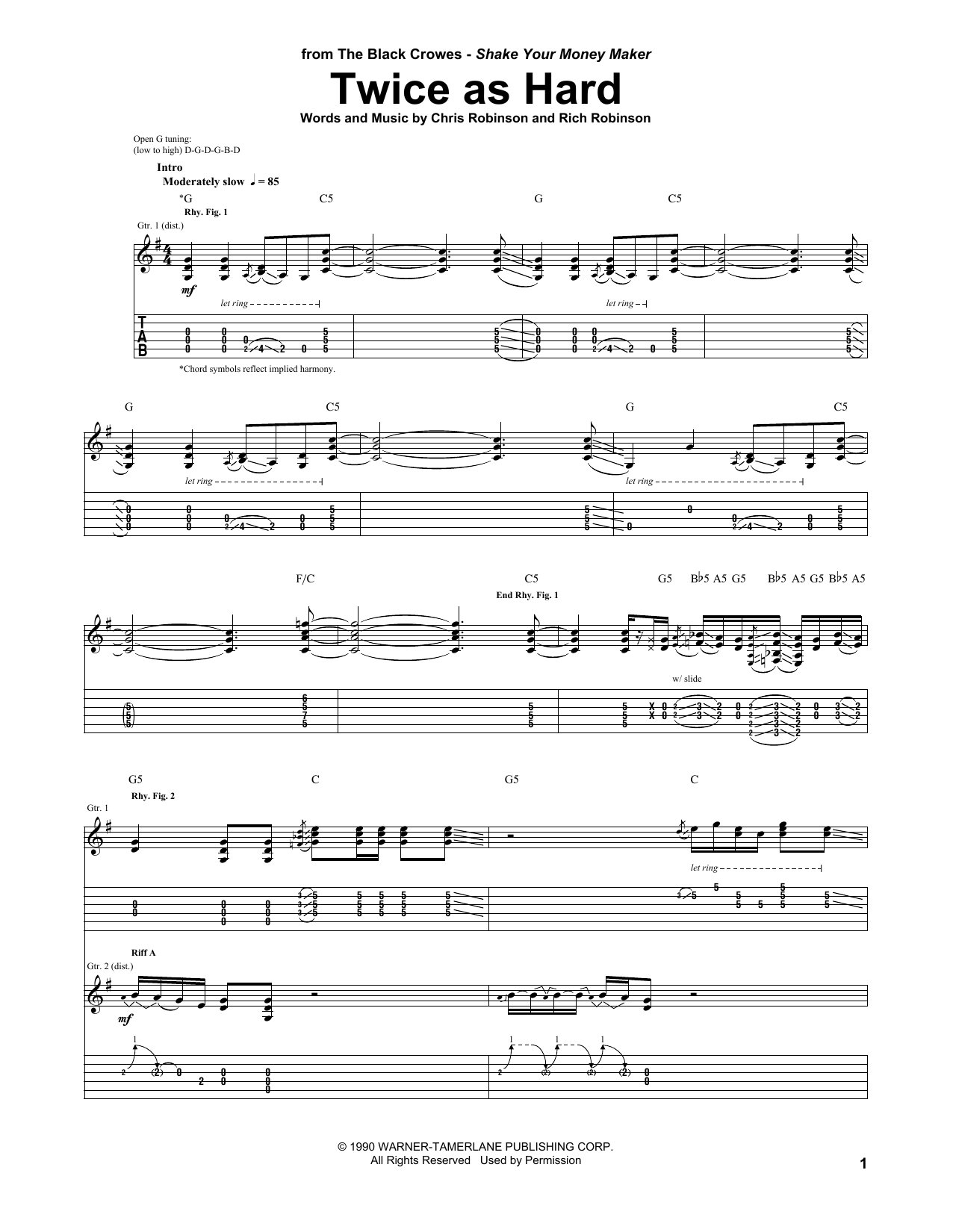 Download or print The Black Crowes Twice As Hard sheet music, chords and digital score arranged for Guitar Tab. This Blues score includes 7 page(s).