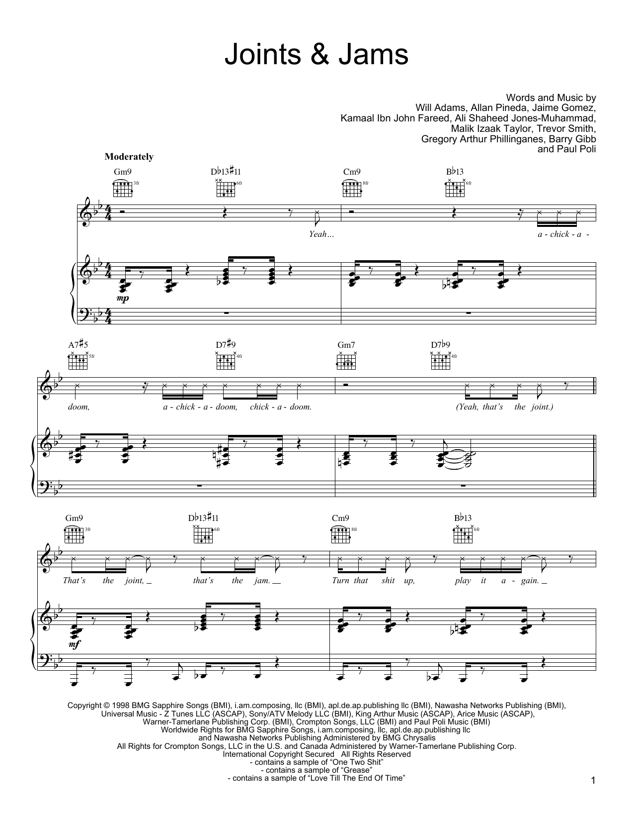 Download or print Black Eyed Peas Joints & Jams sheet music, chords and digital score arranged for Piano, Vocal & Guitar Chords (Right-Hand Melody). This Pop score includes 10 page(s).