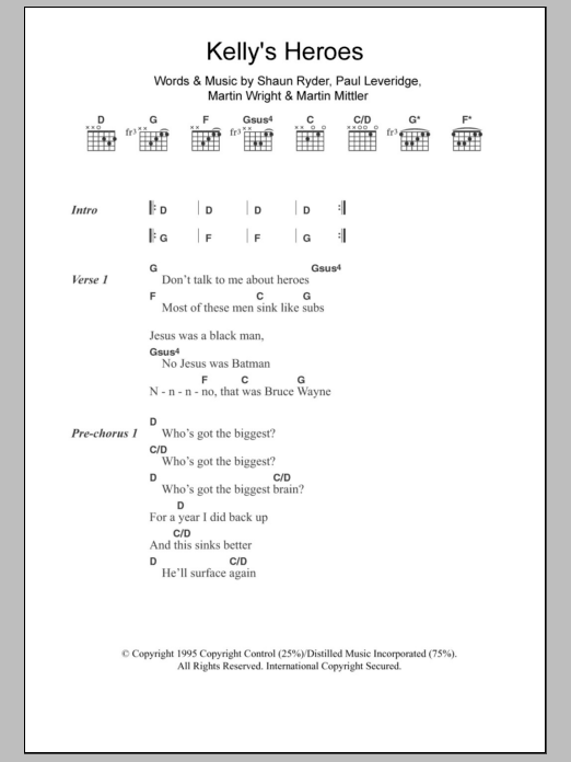 Download or print Black Grape Kelly's Heroes sheet music, chords and digital score arranged for Guitar Chords/Lyrics. This Rock score includes 3 page(s).