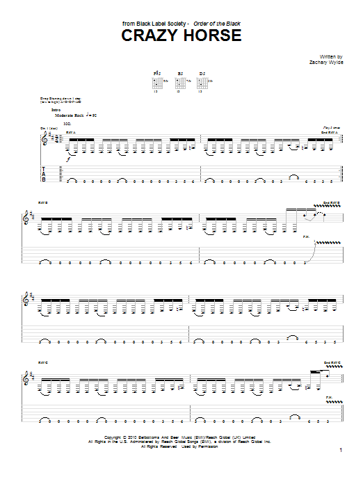 Download or print Black Label Society Crazy Horse sheet music, chords and digital score arranged for Guitar Tab. This Metal score includes 7 page(s).