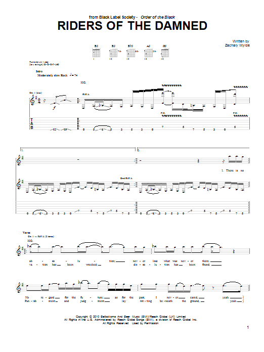Download or print Black Label Society Riders Of The Damned sheet music, chords and digital score arranged for Guitar Tab. This Metal score includes 5 page(s).