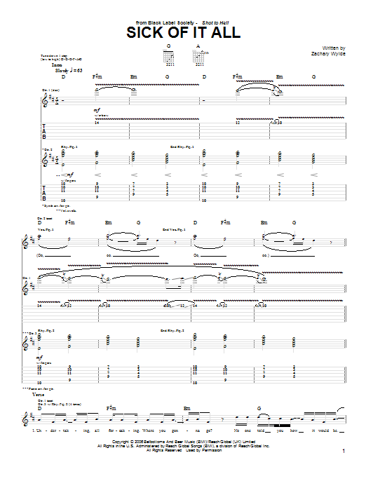 Download or print Black Label Society Sick Of It All sheet music, chords and digital score arranged for Guitar Tab. This Metal score includes 6 page(s).