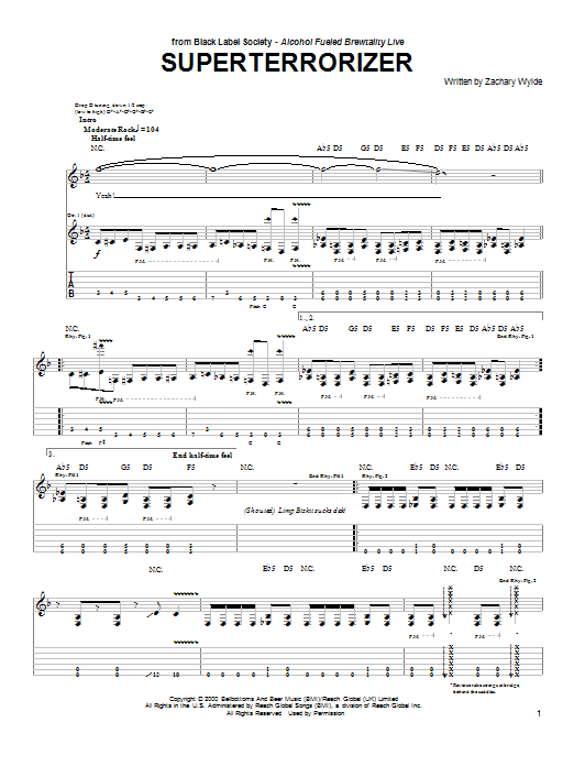 Download or print Black Label Society Superterrorizer sheet music, chords and digital score arranged for Guitar Tab (Single Guitar). This Metal score includes 10 page(s).