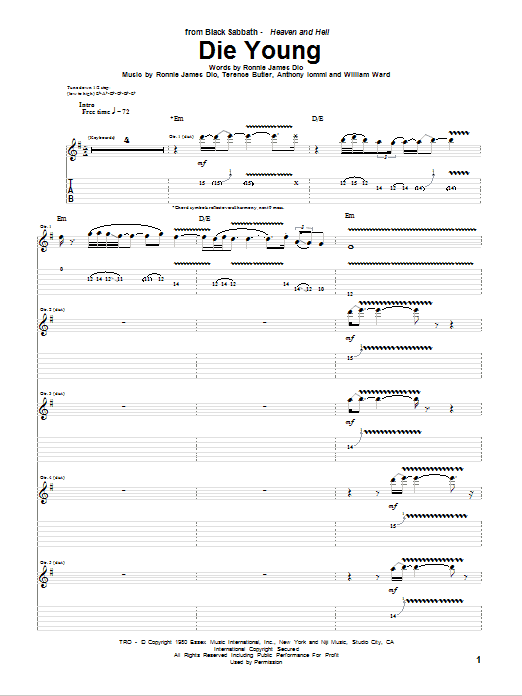 Download or print Black Sabbath Die Young sheet music, chords and digital score arranged for Guitar Tab. This Metal score includes 15 page(s).