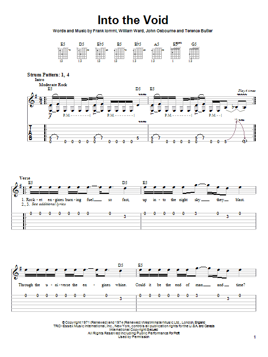Download or print Black Sabbath Into The Void sheet music, chords and digital score arranged for Guitar Tab. This Metal score includes 6 page(s).