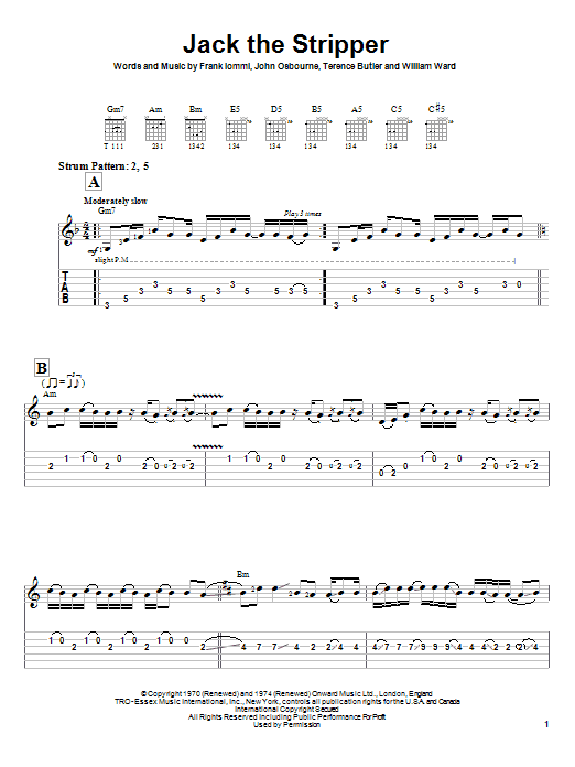 Download or print Black Sabbath Jack The Stripper sheet music, chords and digital score arranged for Easy Guitar Tab. This Metal score includes 2 page(s).