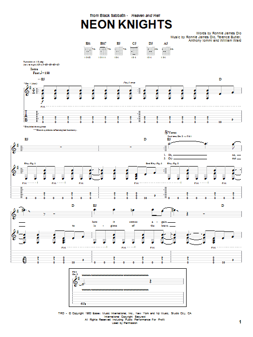 Download or print Black Sabbath Neon Knights sheet music, chords and digital score arranged for Guitar Tab. This Metal score includes 11 page(s).