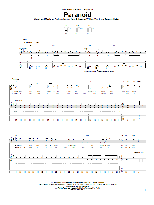 Download or print Black Sabbath Paranoid sheet music, chords and digital score arranged for Solo Guitar. This Metal score includes 2 page(s).