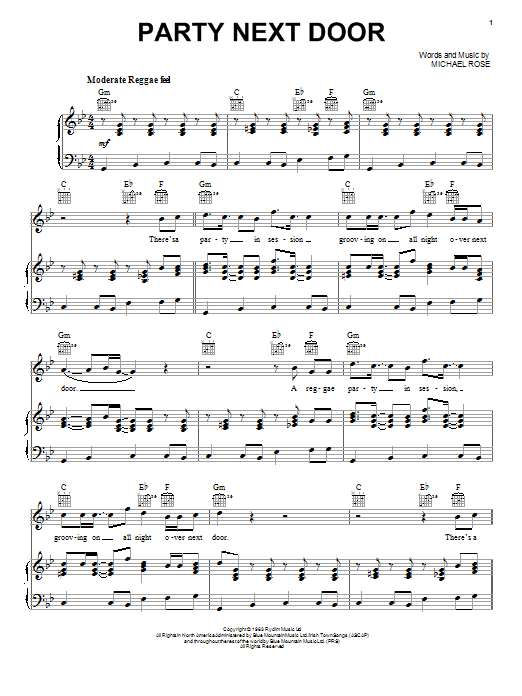 Download or print Black Uhuru Party Next Door sheet music, chords and digital score arranged for Piano, Vocal & Guitar Chords (Right-Hand Melody). This Reggae score includes 8 page(s).