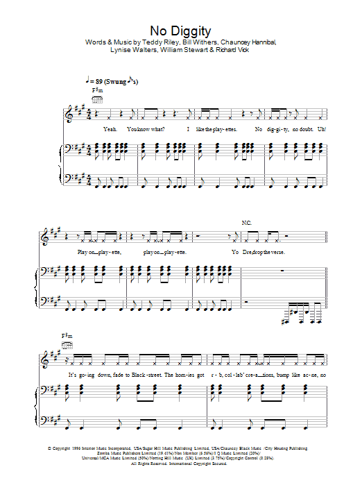 Download or print Blackstreet No Diggity sheet music, chords and digital score arranged for Piano, Vocal & Guitar Chords (Right-Hand Melody). This Hip-Hop score includes 9 page(s).