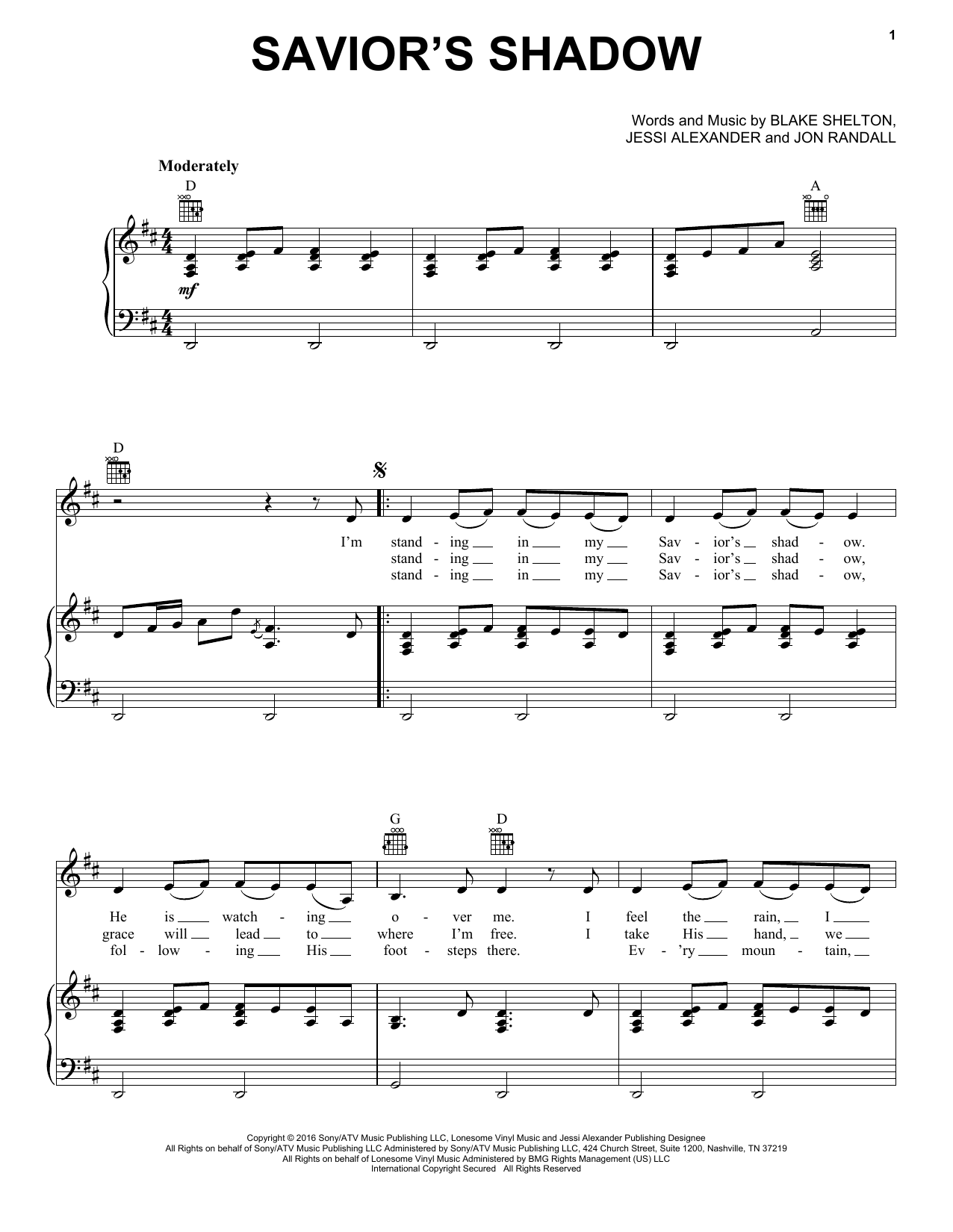 Download or print Blake Shelton Savior's Shadow sheet music, chords and digital score arranged for Piano, Vocal & Guitar Chords (Right-Hand Melody). This Country score includes 4 page(s).