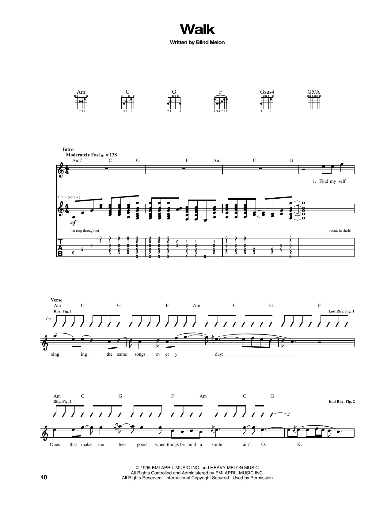 Download or print Blind Melon Walk sheet music, chords and digital score arranged for Guitar Tab. This Metal score includes 8 page(s).