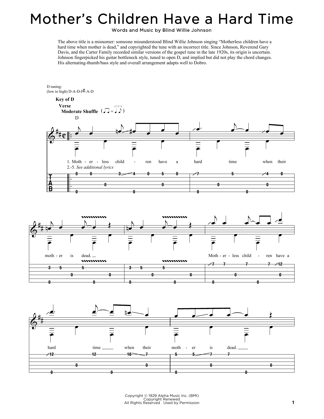 Download or print Blind Willie Johnson Mother's Children Have A Hard Time sheet music, chords and digital score arranged for Dobro. This Folk score includes 2 page(s).