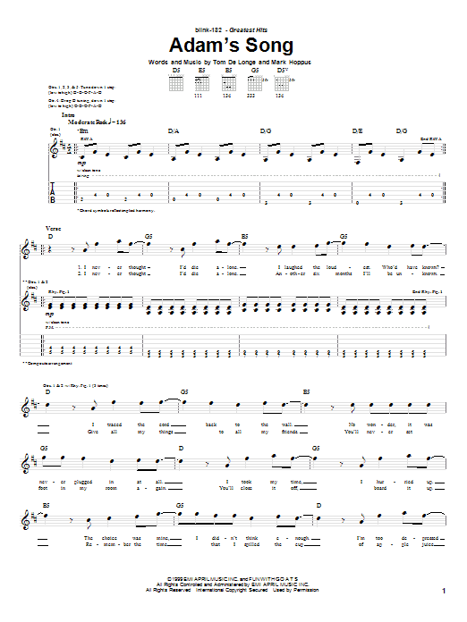 Download or print Blink-182 Adam's Song sheet music, chords and digital score arranged for Guitar Tab. This Pop score includes 5 page(s).