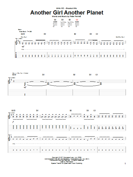 Download or print Blink-182 Another Girl Another Planet sheet music, chords and digital score arranged for Easy Guitar Tab. This Pop score includes 3 page(s).