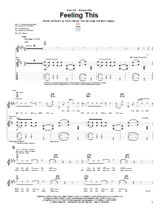 Download or print Blink-182 Feeling This sheet music, chords and digital score arranged for Guitar Tab (Single Guitar). This Pop score includes 5 page(s).