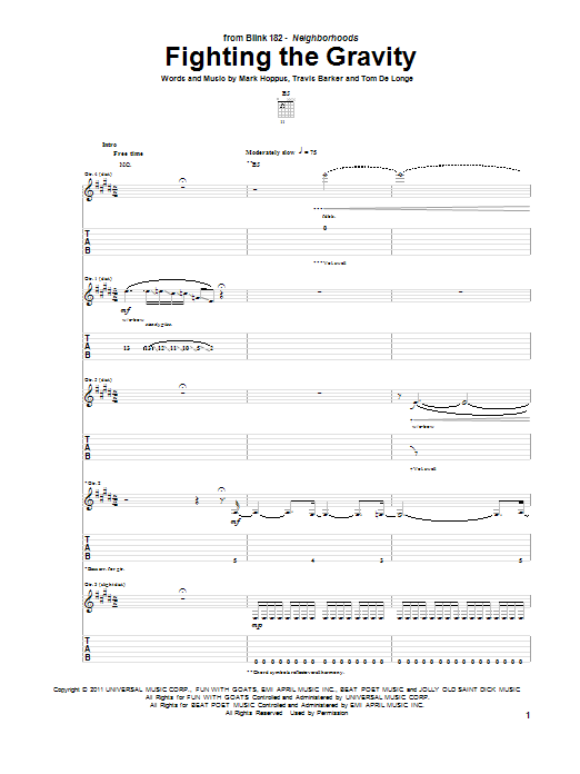 Download or print Blink-182 Fighting The Gravity sheet music, chords and digital score arranged for Guitar Tab. This Alternative score includes 18 page(s).