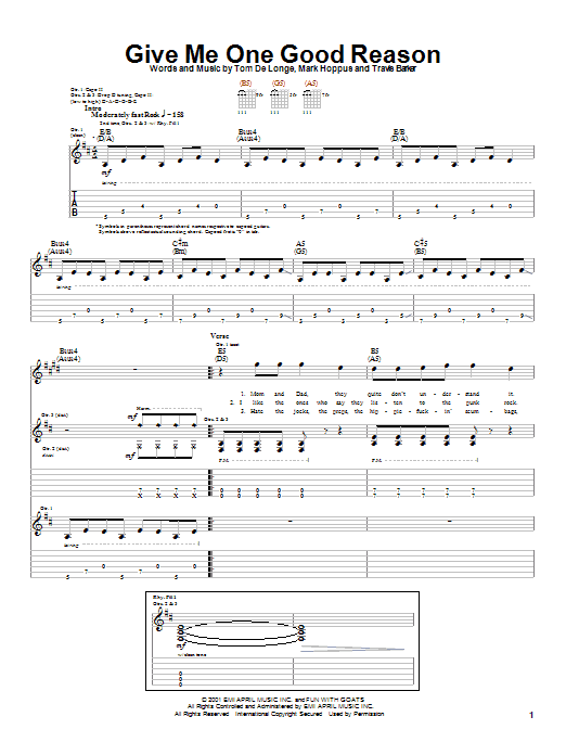 Download or print Blink-182 Give Me One Good Reason sheet music, chords and digital score arranged for Guitar Tab. This Alternative score includes 4 page(s).