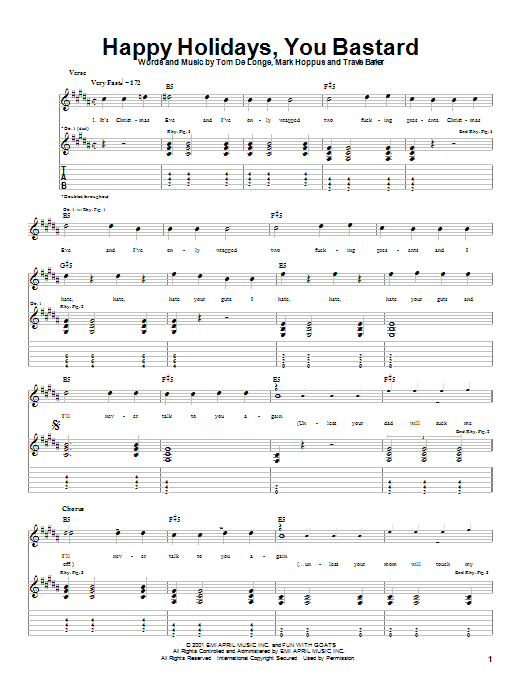 Download or print Blink-182 Happy Holidays, You Bastard sheet music, chords and digital score arranged for Guitar Tab. This Christmas score includes 2 page(s).