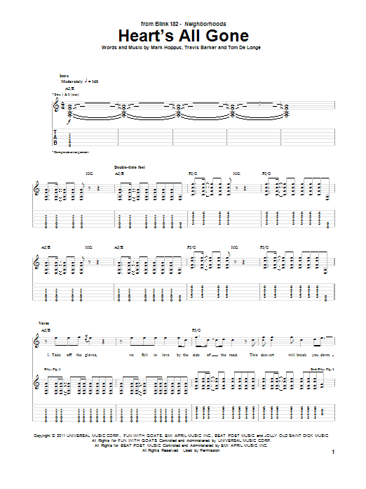 Download or print Blink-182 Heart's All Gone sheet music, chords and digital score arranged for Guitar Tab. This Alternative score includes 6 page(s).