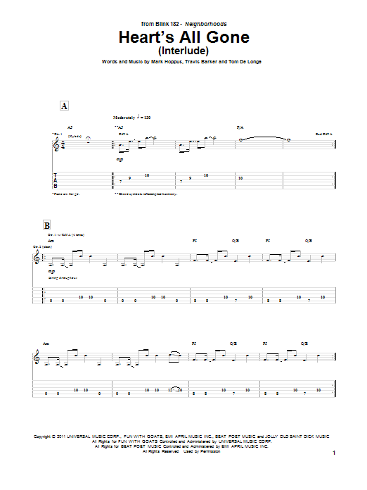 Download or print Blink-182 Heart's All Gone (Interlude) sheet music, chords and digital score arranged for Guitar Tab. This Alternative score includes 2 page(s).