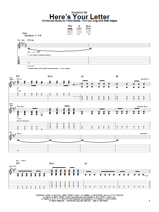 Download or print Blink-182 Here's Your Letter sheet music, chords and digital score arranged for Guitar Tab. This Punk score includes 7 page(s).