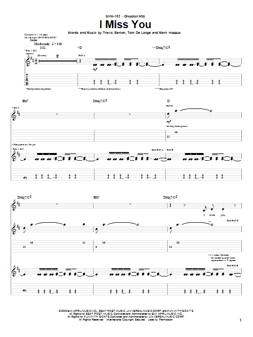 Download or print Blink-182 I Miss You sheet music, chords and digital score arranged for Easy Guitar Tab. This Metal score includes 5 page(s).