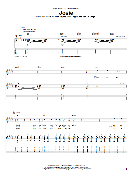 Download or print Blink-182 Josie sheet music, chords and digital score arranged for Easy Guitar Tab. This Pop score includes 5 page(s).