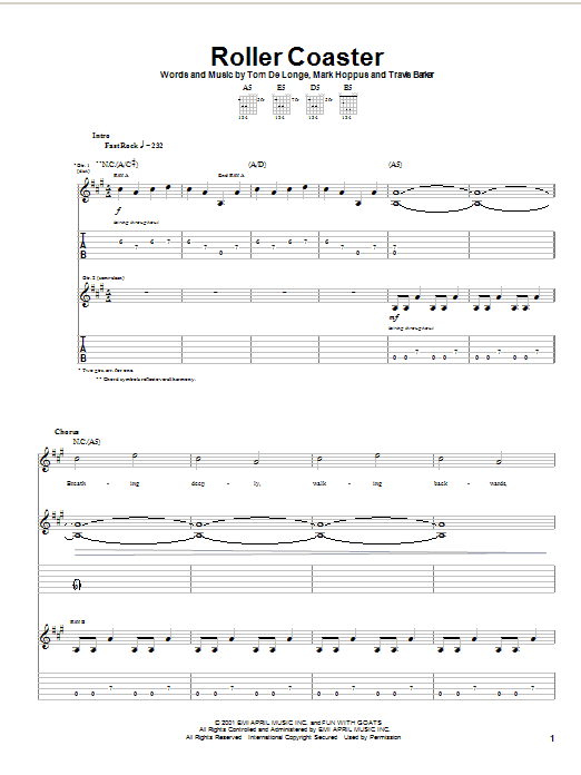 Download or print Blink-182 Roller Coaster sheet music, chords and digital score arranged for Guitar Tab. This Alternative score includes 5 page(s).