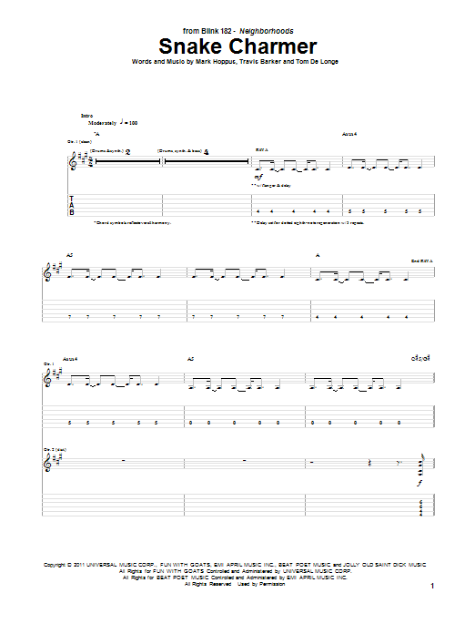 Download or print Blink-182 Snake Charmer sheet music, chords and digital score arranged for Guitar Tab. This Alternative score includes 8 page(s).