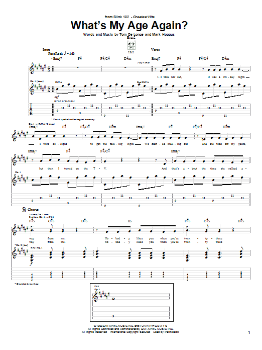 Download or print Blink-182 What's My Age Again? sheet music, chords and digital score arranged for Guitar Tab (Single Guitar). This Pop score includes 6 page(s).